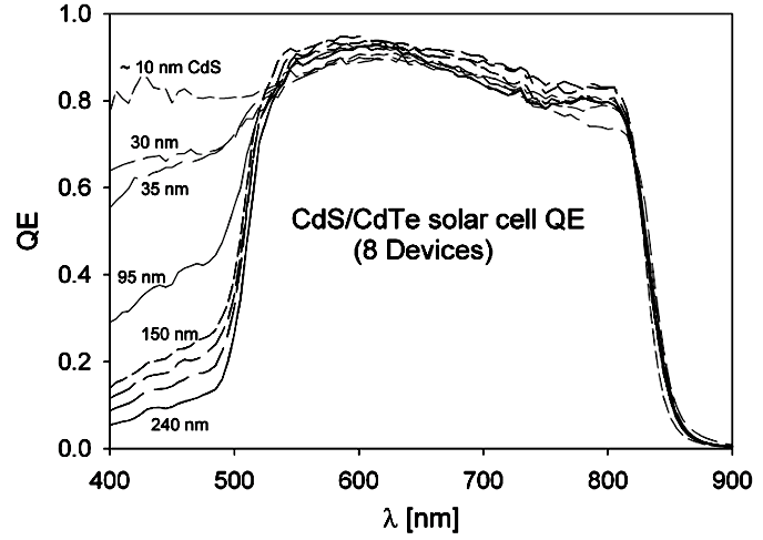 CdTe and CIGS have been selected because their bandgap efficiency is very good, so a very thin layer can capture much of the sun’s energy. This is where they get the name “thin film.” (One interesting thing in the chart below: notice how the thinner CdS layer (which is physically in front of the CdTe) improves the cell efficiency. This illustrates the shading phenomenon – just a small taste of what the folks at First Solar and Abound are working on…)