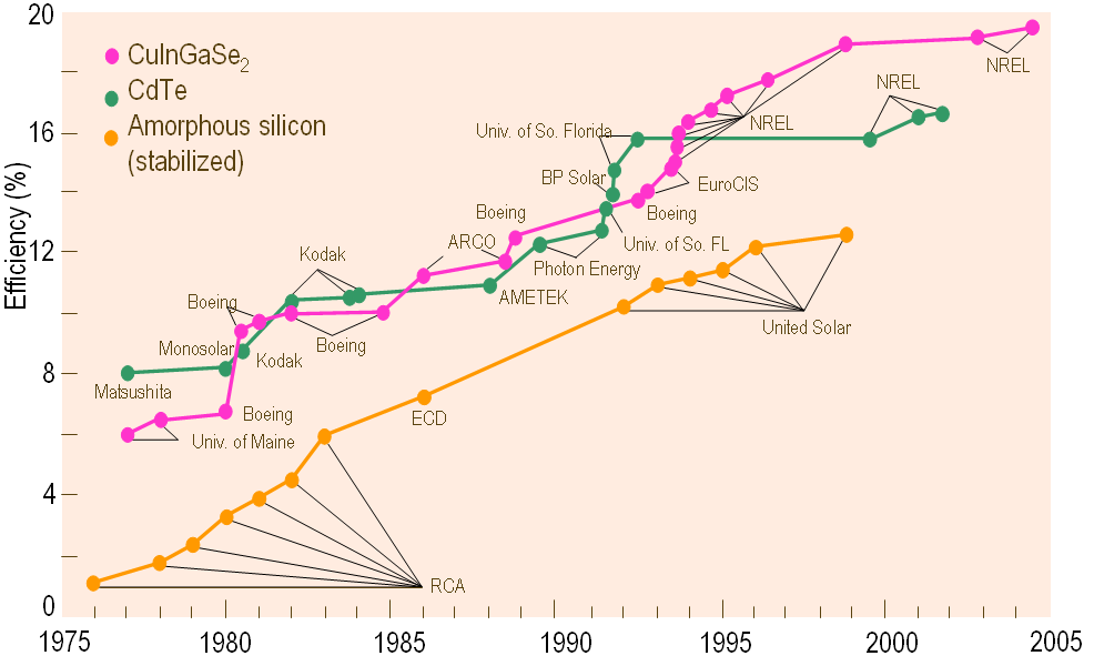 Pretty close, huh? That’s why it’s still an open debate. Physicists tend to predict that CIGS will eventually win – the lab efficiency is so much higher! But manufacturers have a healthy respect for the simplicity of CdTe; First Solar may keep the thin-film efficiency crown for years to come, through their manufacturing prowess. And only time will tell.