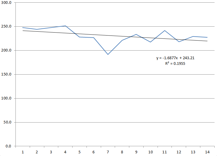 This year, through 14 weeks, there is a small downward trend in passing yards (see the chart below). On average, the teams pass for approximately 1.7 fewer yards each week. However, the R-squared value (.195) means that only about 20% of the weekly variation can be explained by the timing through the season.