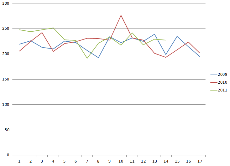 Weekly Passing Yards per Game – 2009, 2010, and 2011