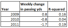 When looking at all three years, the downward trend doesn’t seem as significant. In fact, 2009 actually had a slightly positive change in passing yards over time (+0.8 yards per week), while 2010 was just a negative (0.8) passing yards per week. It seems like there isn’t much seasonality to passing yards at all.