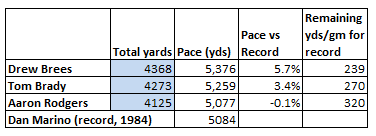 Another way to look at it: how many yards per game would they have to get in their final three games in order to just break Marino’s record? For Rodgers, it’s 320 yards for each of his remaining three games. For Brady, 270 yards per game. Drew Brees only needs 239 yards per game from here on out.