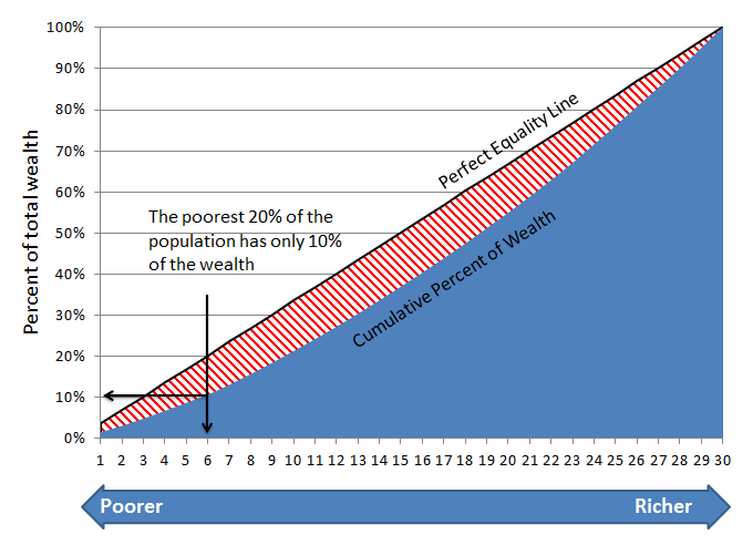 Gini coefficients are used by economists to measure inequality within a population. Basically, you sort the population from poorest to richest, and plot the curve of their cumulative wealth (shown as the blue curve below). You then compare that to a straight line (which would represent perfect equality). The ratio of the area between the curves (the red striped area) to the total area (red plus blue) is the Gini coefficient. So perfect equality would be a gini coefficient of 0, while perfect inequality would be a Gini coefficient of 1.0.