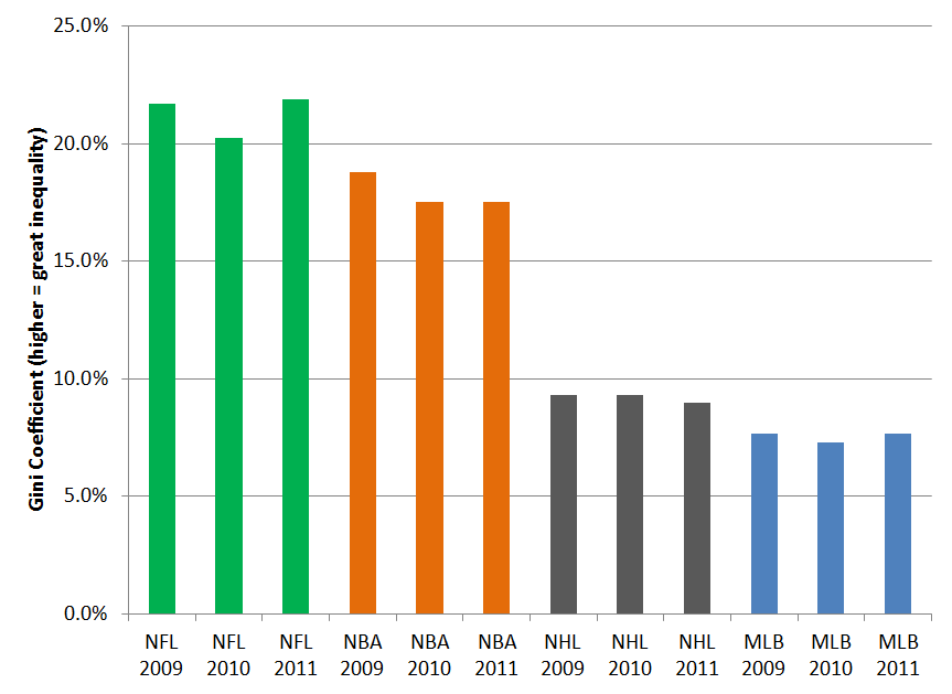The actual Gini coefficient for the NBA that year, or the red area divided by the red + blue areas, is 0.175 (or 17.5%). So, how does this compare to other sports?