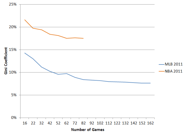 Sampling smaller subsets of the MLB and NBA 2011 seasons, we can see that the Gini coefficients increase with fewer games, as expected. In fact, The NBA Gini coefficient with 16 games is 22% – right in line with the NFL Gini coefficients.