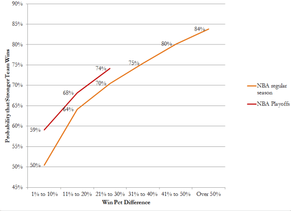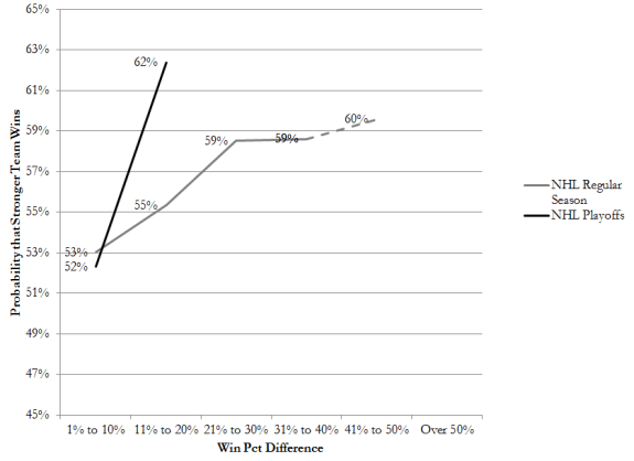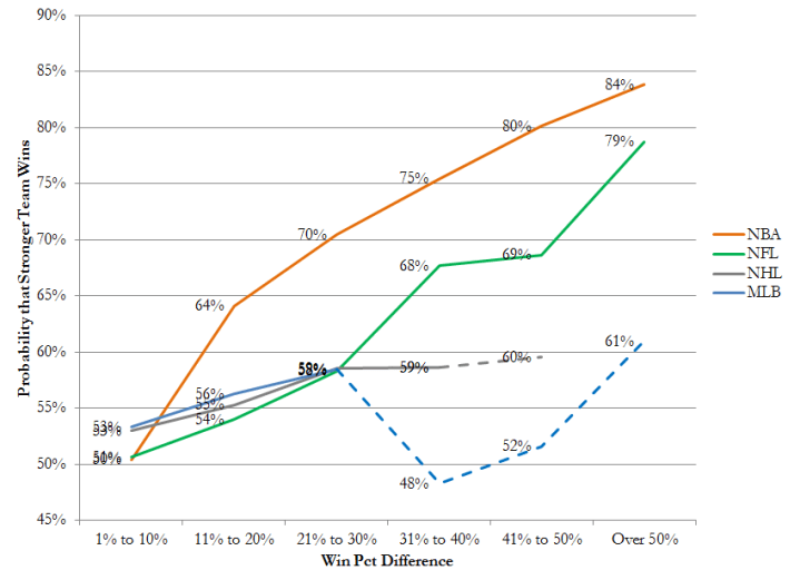 But the parity in the NHL and MLB is pretty striking. This chart implies that in those sports, even in the most lopsided games, the stronger team could only be expected to win about 60% of the time[2].