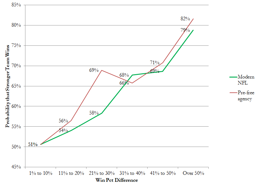 When the NFL instituted modern free agency between 1987 and 1992, the parity in the NFL increased, making good teams less dominant and upsets more likely. This can be seen in the chart below, where the higher red curve indicates fewer upsets before free agency: