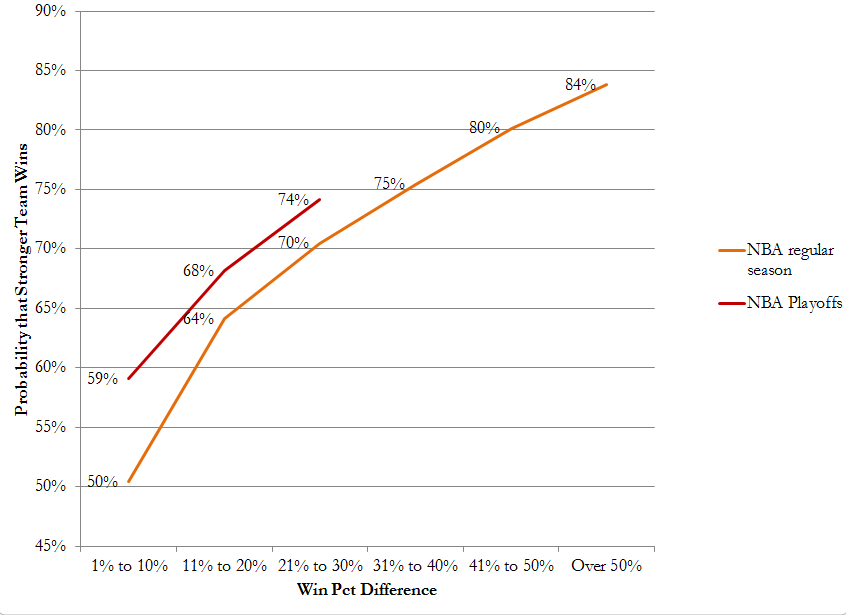 Instead, it’s more interesting to ask the question: if one team is better than another, what is the probability that the better team wins?
