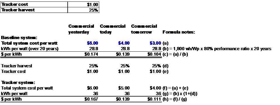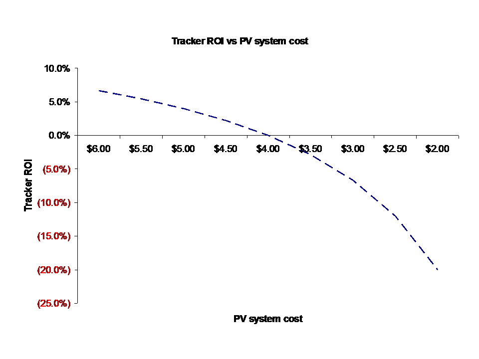 All of the costs here (including system and tracker cost) are approximate. But again, the fundamental relationship (lower PV costs lead to lower tracker ROI) will be the same.