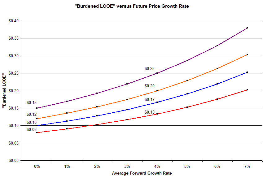 I’ve created a metric called “Burdened LCOE”. For this, I’m simply starting with today’s energy rates, and then growing them over 25 years, at different growth rates. The 25-year average is the burdened LCOE.