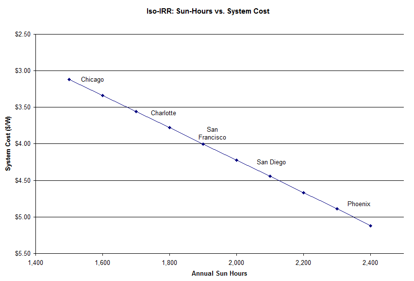 The Iso-IRR curve seems to be a popular way to think about different solar plants. So I wanted to use it to look at how much sun matters.