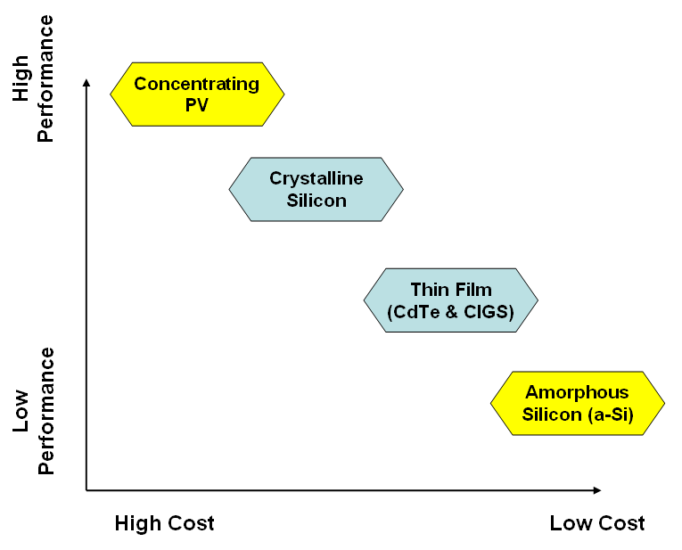 There are two technologies that have taken new approaches to the efficient frontier: amorphous silicon (low cost, low efficiency), and concentrating PV (high efficiency, but higher system cost). Neither approach is guaranteed to pay off. I’ll break down the outlook on both.