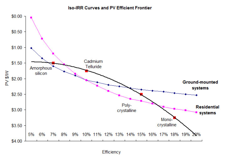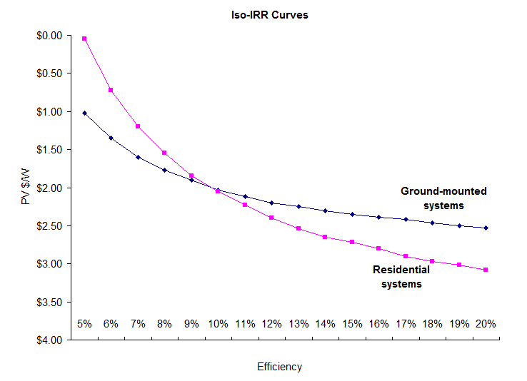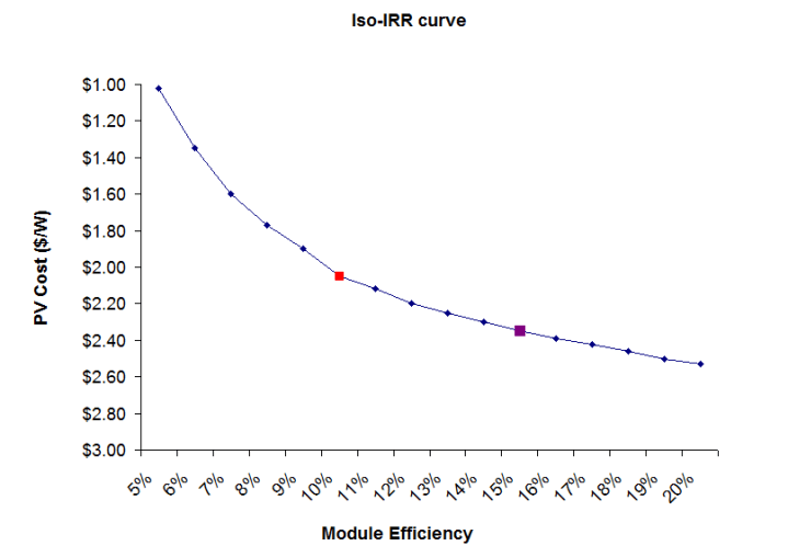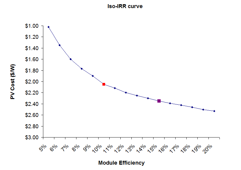 So far I’ve shown a basic iso-IRR curve (in the earlier post “Low-efficiency penalty”) to get a sense for the penalty that low-efficiency modules have to pay. (The quick overview: this is a way of showing the tradeoff between efficiency and price, for the developer. Solar modules on the curve would provide the same financial returns for the project. Lower-efficient panels require more racking and labor, so they have to lower their price to be equally competitive.)